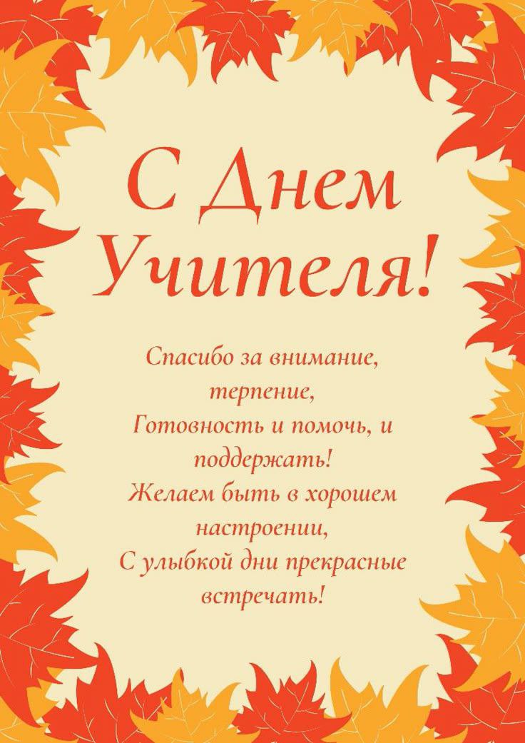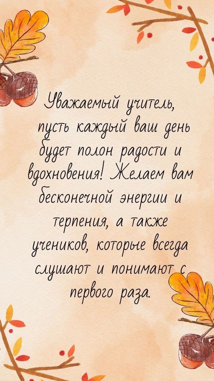 В этот знаменательный день желаем вам крепкого здоровья, неиссякаемой энергии и новых профессиональных свершений! Пусть ваши ученики радуют вас своими успехами, а ваша работа всегда приносит удовлетворение и гордость за достигнутые результаты.