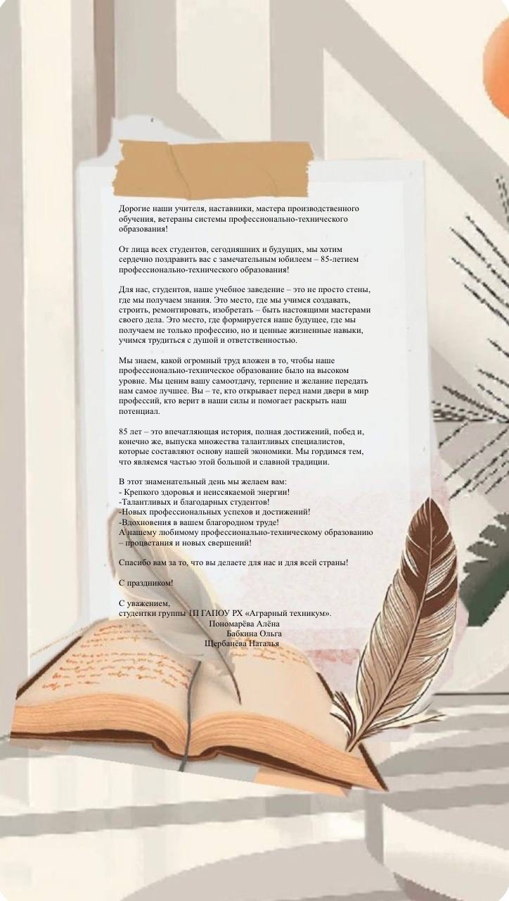 Мы, ваши студенты, с огромной радостью поздравляем вас с замечательным юбилеем - 85-летием среднего профессионального образования! Это не просто цифра, это целая эпоха, наполненная кропотливым трудом, передачей знаний, формированием поколений специалистов, которые строят, изобретают, развивают и двигают вперед нашу страну